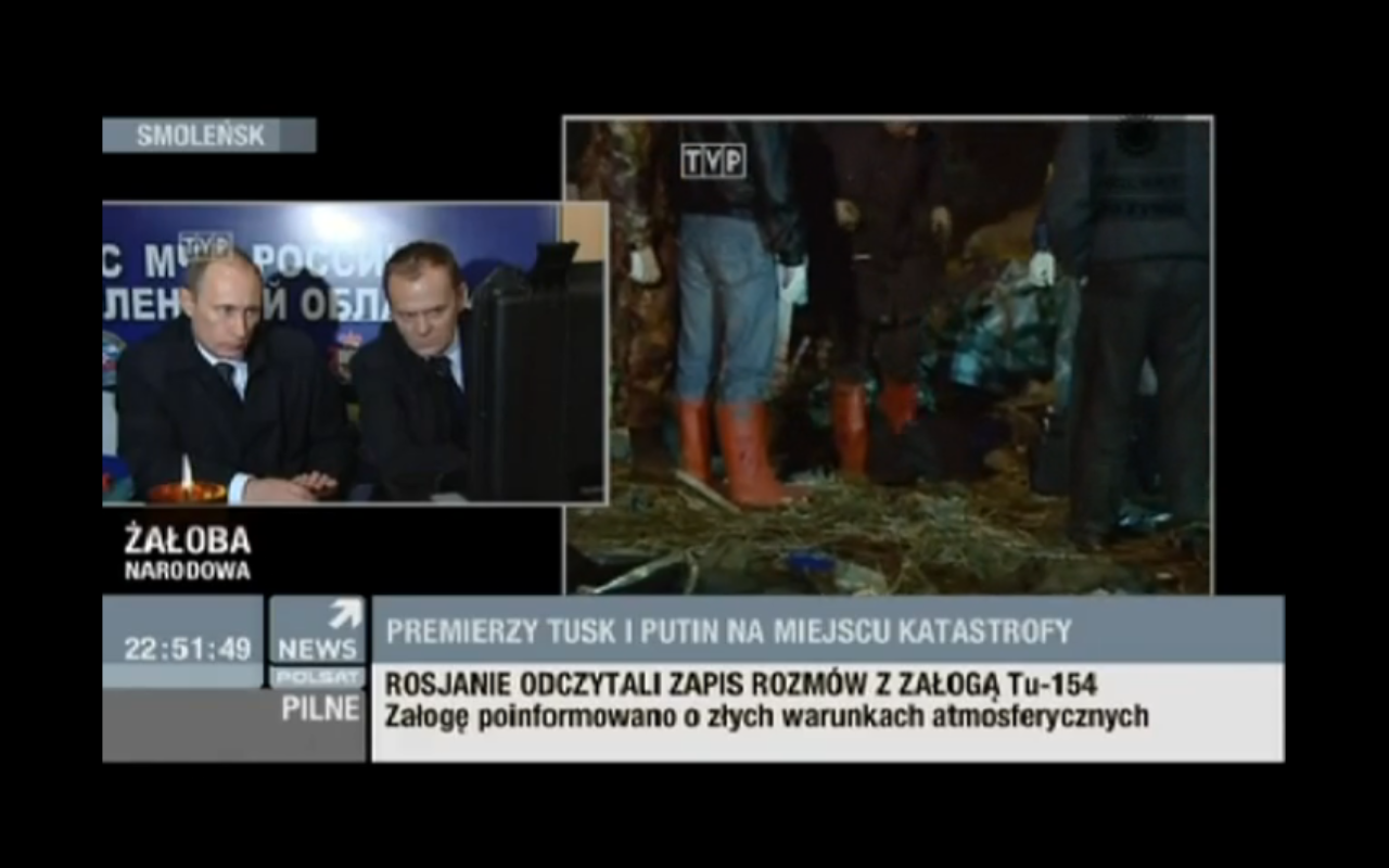 „I przed sekundą dosłownie otrzymałem informację od rzecznika sz... rzecznika polskiej dyplomacji, rzecznika MSZ-u, Pana Piotra Paszkowskiego, który potwierdził, że prezydencki samolot JAK 40 rozbił się niedaleko lotniska wojskowego w Smoleńsku. JAK 40 rozbił się niedaleko wojskowego lotniska w Smoleńsku... (…) Przypomnę raz jeszcze: informacja sprzed kilku sekund dosłownie: rzecznik MSZ-u Pan Piotr Paszkowski potwierdza w rozmowie z TVN24, że według wstępnych informacji prezydencki samolot JAK 40 którym Prezydencka Para, prezydencka delegacja leciała na 70 rocznicę zbrodni katyńskiej, rozbił się podchodząc do lądowania niedaleko wojskowego lotniska w Smoleńsku. Mamy dwa źródła REUTERS i rzecznik MSZ-u: Prezydencki JAK 40 rozbił się niedaleko lotniska, na lotnisku w Smoleńsku. Ta informacja dotarła do nas około godziny 9-tej.Nie chcieliśmy jej Państwu podawać bo nie mieliśmy żadnych sprawdzonych informacji. Nie robimy tego nigdy.